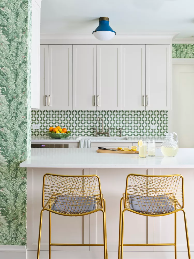 These white upper flat panel cabinets across the kitchen are the epitome of simple—but they’re far from boring. The white cabinets set the stage for the gorgeous green and white geometric tiled backsplash and botanical-theme wallpaper in this kitchen. If you want to make a statement with the walls or backsplash, it’s a good idea to keep the cabinets more subdued.