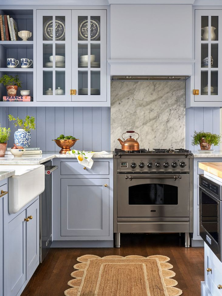 A light blue hue gives these country-inspired cabinets a charming makeover. The glass-front cabinets paired with the vertical shiplap backsplash—painted the same color blue—create a cool backdrop for vintage-inspired copper elements and fresh greenery.