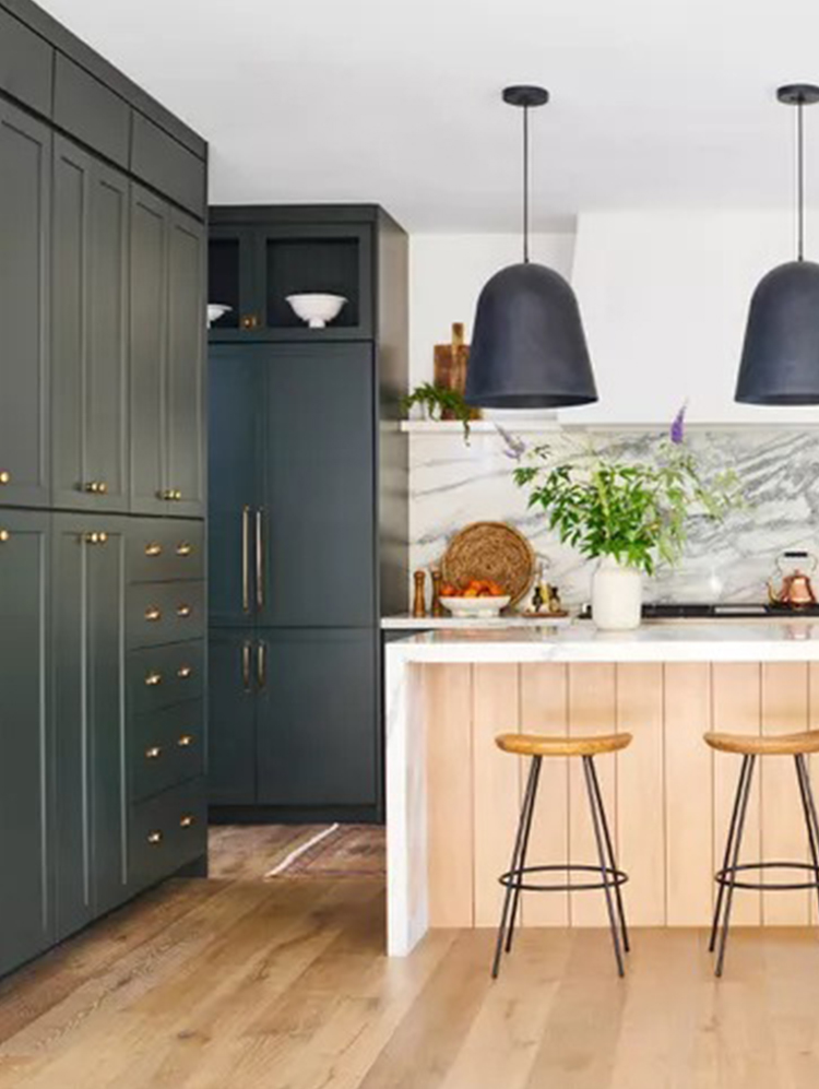 Color plays a role: cabinetry is used as a statement element (e.g., moody green, light wood accents, neutral marble backsplashes), while finishes like brass hardware and mixed materials bring polish and texture.