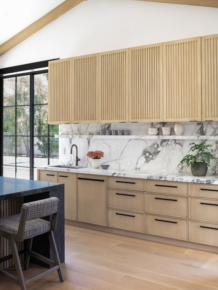 For fans of minimal designs but want to add some character to their kitchen, try a fluted look on the upper cabinets only. This vertical fluted molding adds texture and visual interest but the light wood and black pulls used on all of the cabinets keeps them modest.