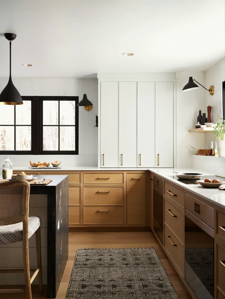 This modern farmhouse kitchen is understated yet captivating thanks to the two toned cabinets with ultra-slim Shaker trim and stunning brass hardware. The thin, tall white upper cabinets reach almost to the ceiling and rest on a white porcelain countertop, while the tan oak base cabinets blend in with the hardwood floors. The end result is a seamless and stylish space that you’ll want to spend most of your time in.