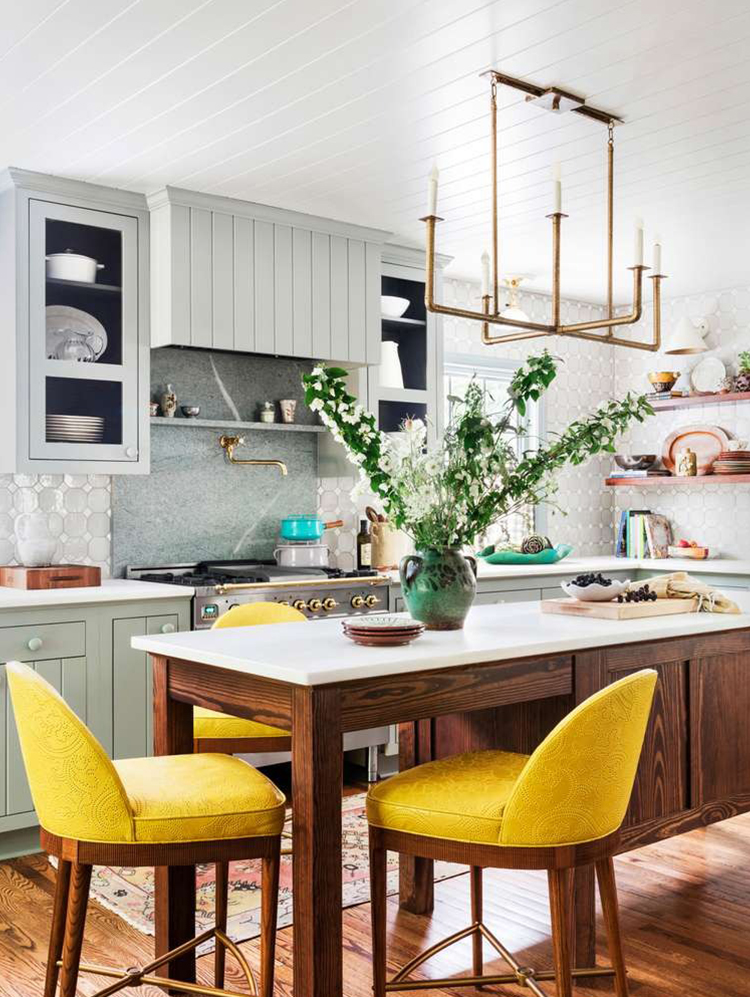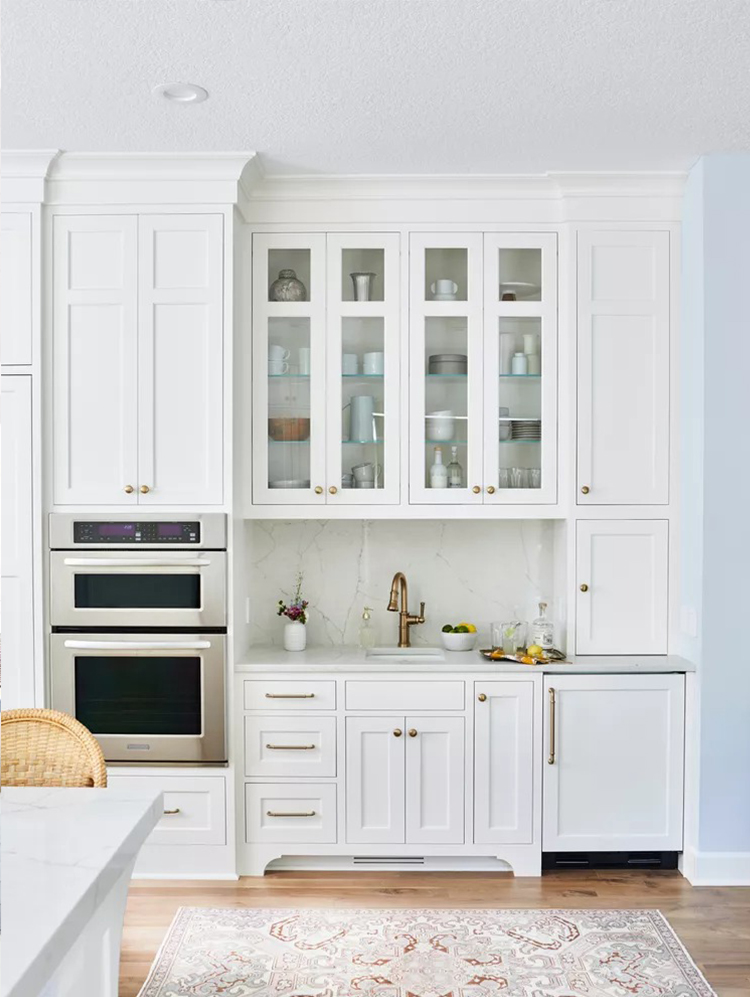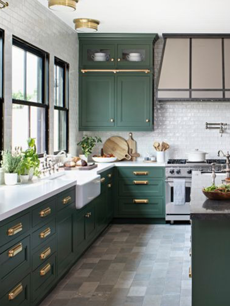 To really give your kitchen a wow factor, consider painting the cabinets in a gorgeous glossy forest green. Pair them gold hardware, including the rails for a library ladder to roll when you need to reach something on the top shelves. Glass front doors added to just a couple of those top shelves breaks up the green slightly.