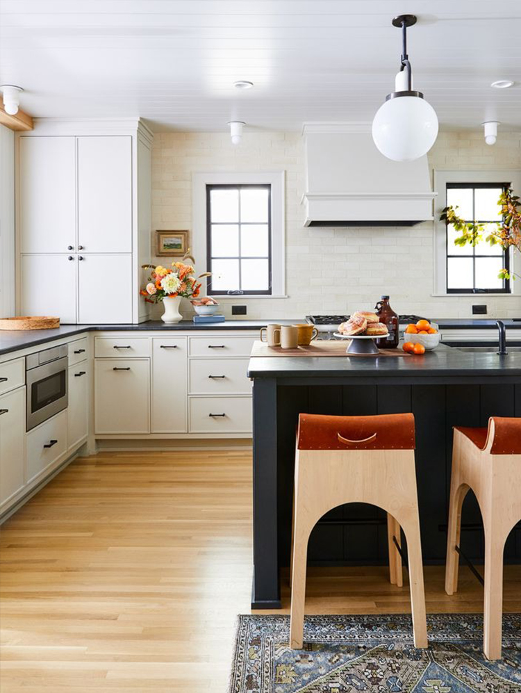 This kitchen's bright light and crisp linear design is a model of modern Scandinavian inspiration. The slab-front kitchen cabinet idea is often influenced by industrial style, but a thoughtful selection of materials and finishes gives these a softer appeal. A solid black island adds a focal point that brings contrast to the otherwise sleek, minimal style.