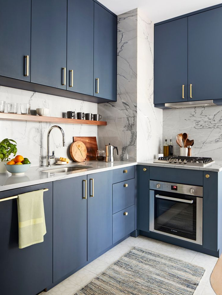 This colorful kitchen welcomes urban style with a hint of classic style. Strikingly squared-off, flat-front cabinets drive the contemporary scheme. A creamy marble backsplash melds rich, traditional warmth with a popular updated palette. Sleek gold drawer pulls echo the sleek appliances, while a wood floating shelf adds a bit of personality.
